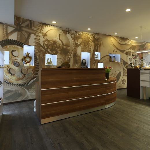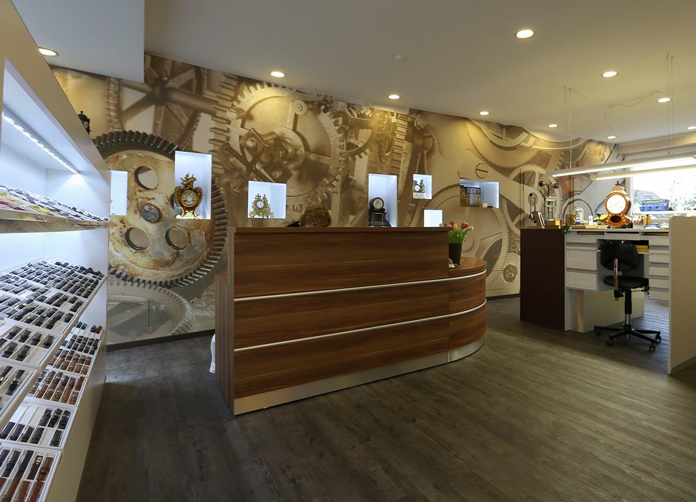 Die Werktische wurden aus den hinteren Räumen in den Verkaufsraum verlagert, und so entstand eine „gläserne Uhrmacher-Werkstatt“: dem Meister bei der Arbeit über die Schulter sehen – wo kann man das schon?